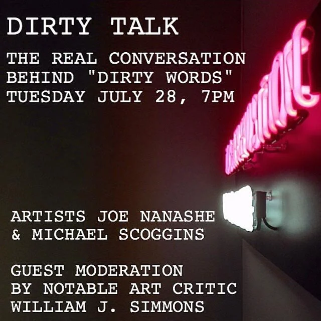In the summer of 2015, artist and curator, Chris Bors posted a photograph on Facebook of an artist talk for Dirty Words. Scoggins had partnered with an old friend Joe Naneshe for a two-man show at Victori + Mo’s pop-up space. Scoggins’ career had blown up – he was in the permanent collection at MoMA and his prices had gone up a digit since our first encounter. Though Dirty Words was exhibited in the summer, it was at the caliber of a show in the high season in Chelsea.