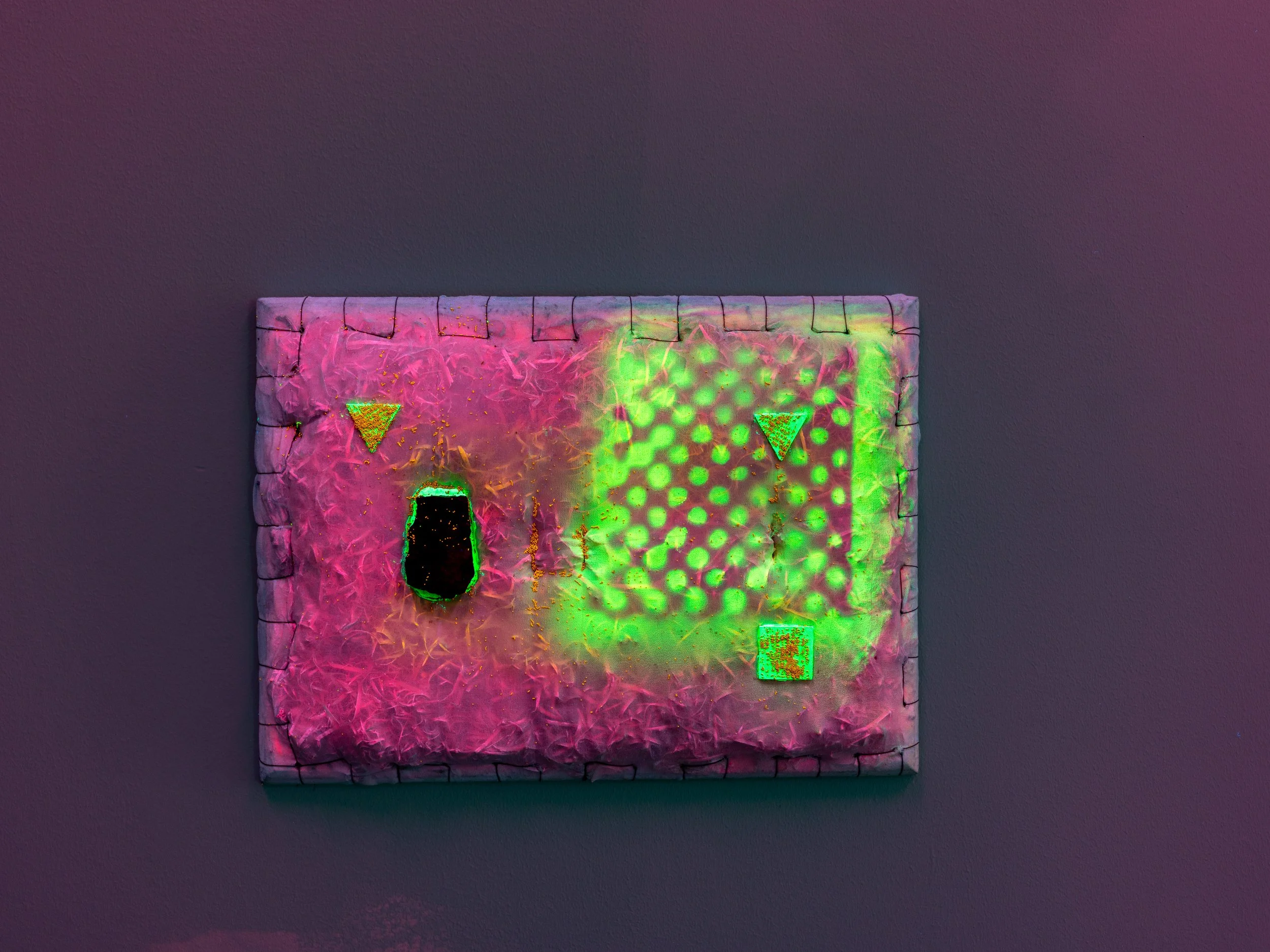 Ryan DaWalt's ultraviolet paintings and magnetic works reveal bits of the world outside the visible electromagnetic spectrum. Rather than simulating this reality within ours by lifting imagery from one part of the spectrum and dropping it in another, like the infra-red vision sequences in the Predator films, his works bring us into this parallel world by flooding the exhibition space with ultra-violet radiation. While these paintings might be interesting to look at in a conventionally-lit environment when drenched with black light, the paintings glow with unnaturally vibrant colors that may not otherwise be visible.