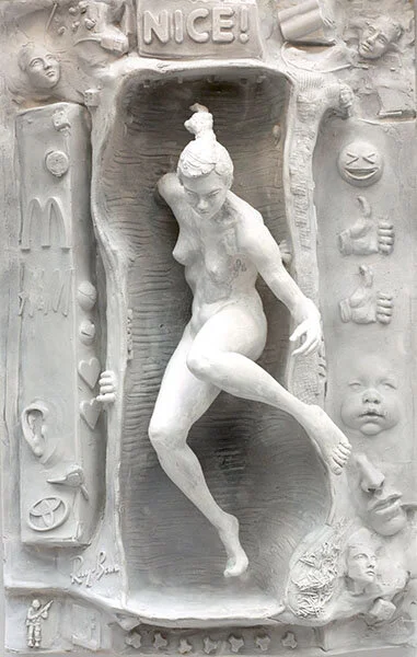 Clyatt’s work isn’t purely figurative but often features the female human form in a prominent role. Cscape #27: Nice! — one of his deepest reliefs in the show — features a nude woman emerging from a niche — or is it a sarcophagus? — surrounded by toys, logos, and, another form of contemporary hieroglyphs, emojis. The figure is presented in such deep relief that she appears ready to break apart from the frieze from her own weight. She leaps from one abyss to another, from the solidity of plaster and marble towards thin air and an uncertain fate.