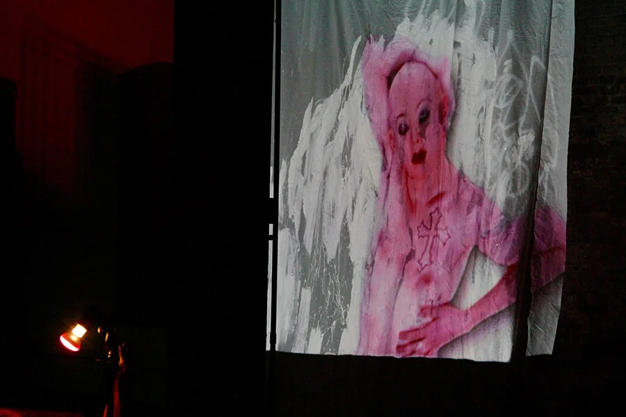 DIRTY SECRET II at The Invisible Dog in Brooklyn was a mental journey through consumption, the macabre and over-indulgence. It was entirely interactive, subversive and transformative. Four femme masked performers sloshed about, indulging in gluttonous behavior, getting live tattoo’d and consuming the “American dream” to an original industrial soundscape by renowned artist Brian Wenner of Prism House and accompanying video projections.