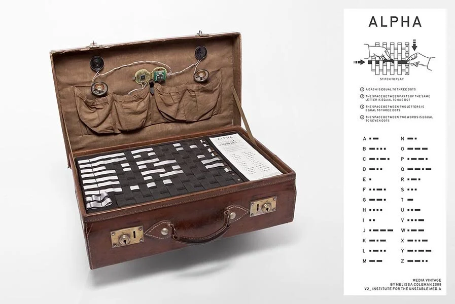 Media Vintage: Alpha is a suitcase with a re-mediating ribbon platform that can be used to write analog Morse Codes.