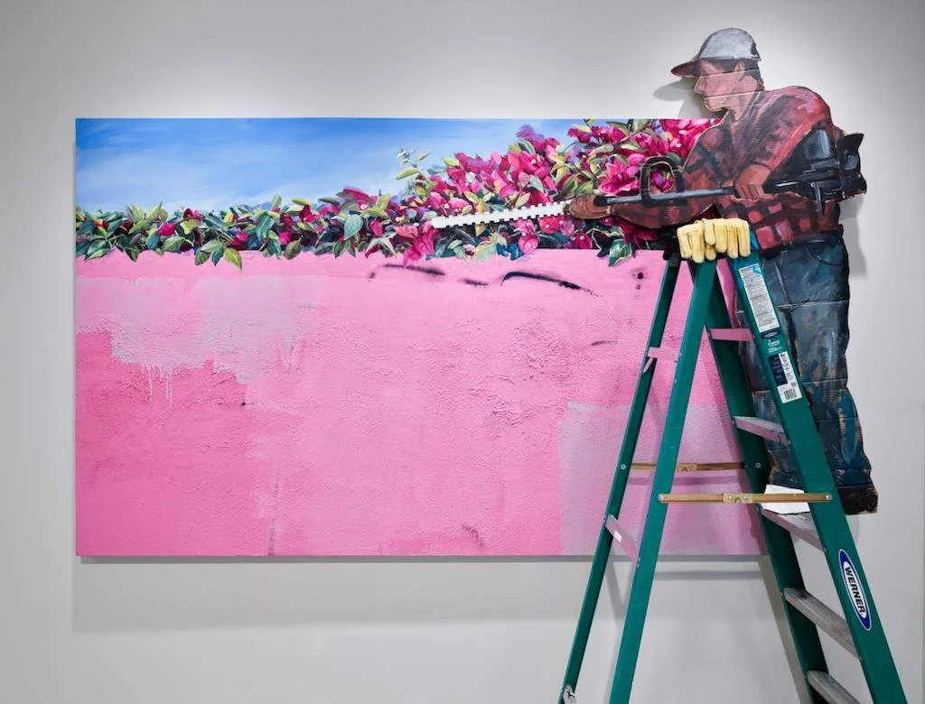 Central to the exhibition is Against the Wall by Patrick Martinez and Jay Lynn Gomez. Both artists, bound by the shared experience of having immigrant parents in domestic labor, present a piece that harmoniously merges a canvas depicting blossoms with a cardboard silhouette of a horticulturist. The horticulturist stands proudly, flanked by vital tools of his trade: a ladder, gloves, and a strikingly realistic hedge trimmer. However, there are visible signs of wear and tear: a notable bandage wrapped around his foot hints at a recent injury.