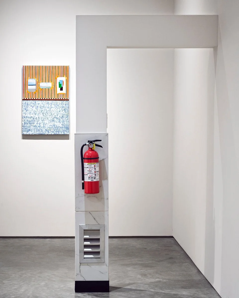 The fire extinguisher affixed to the column highlights Hacmon’s critique of the “redundancy of security.”