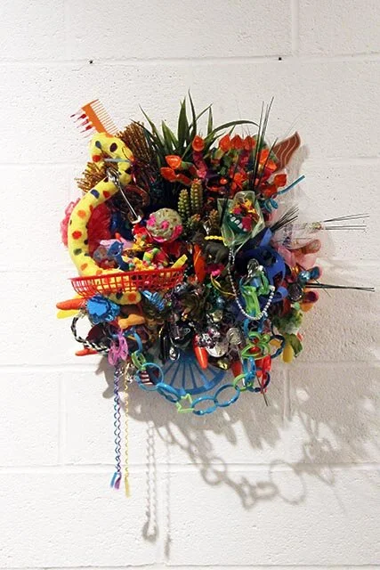 acrylic paint, spray paint, glitter, silicone, found objects on canvas