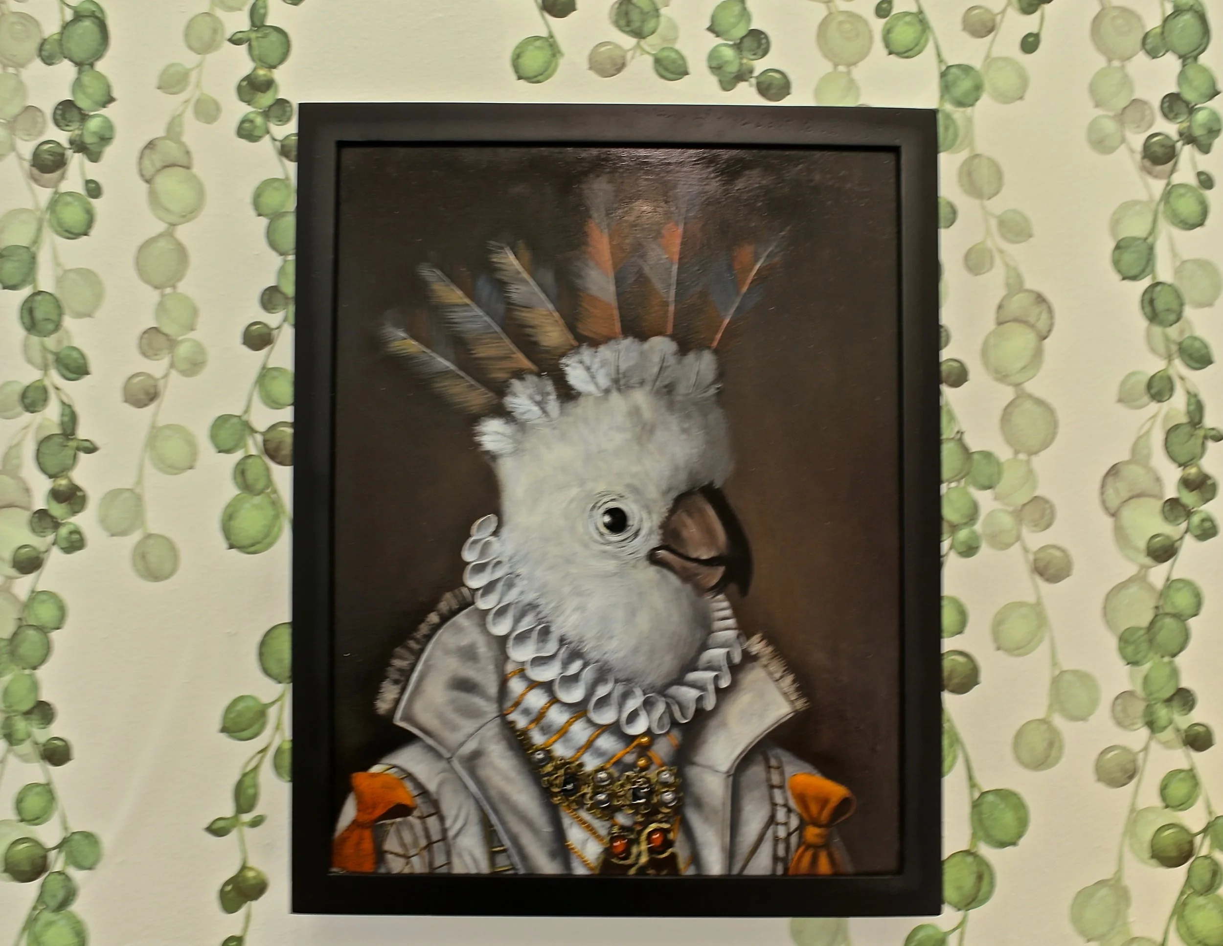 Amy Hill, Bird with Orange Bows, 2022, oil on panel, 11 x 14 in., curated by Kathleen Vance and Daniel Aycock