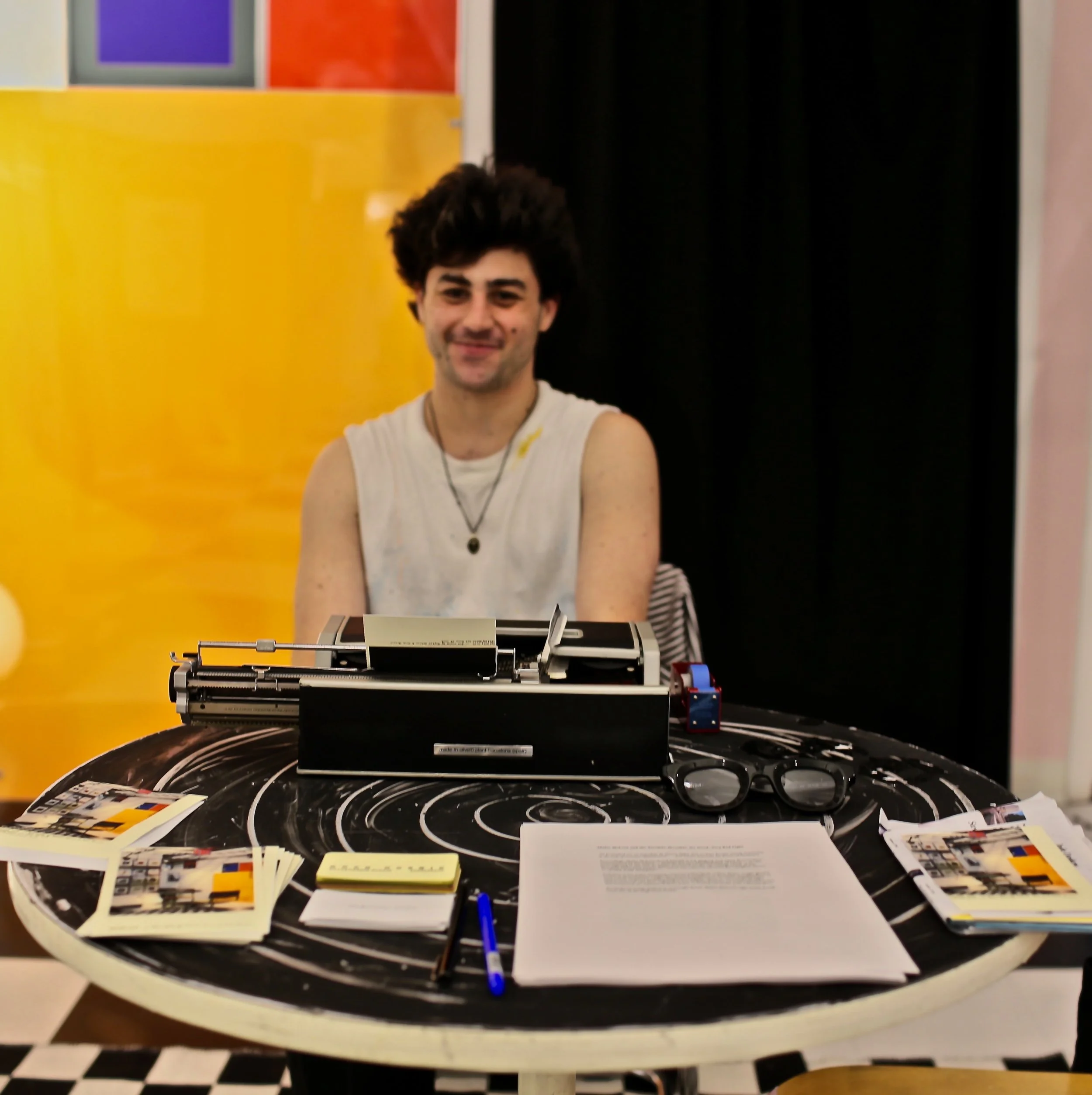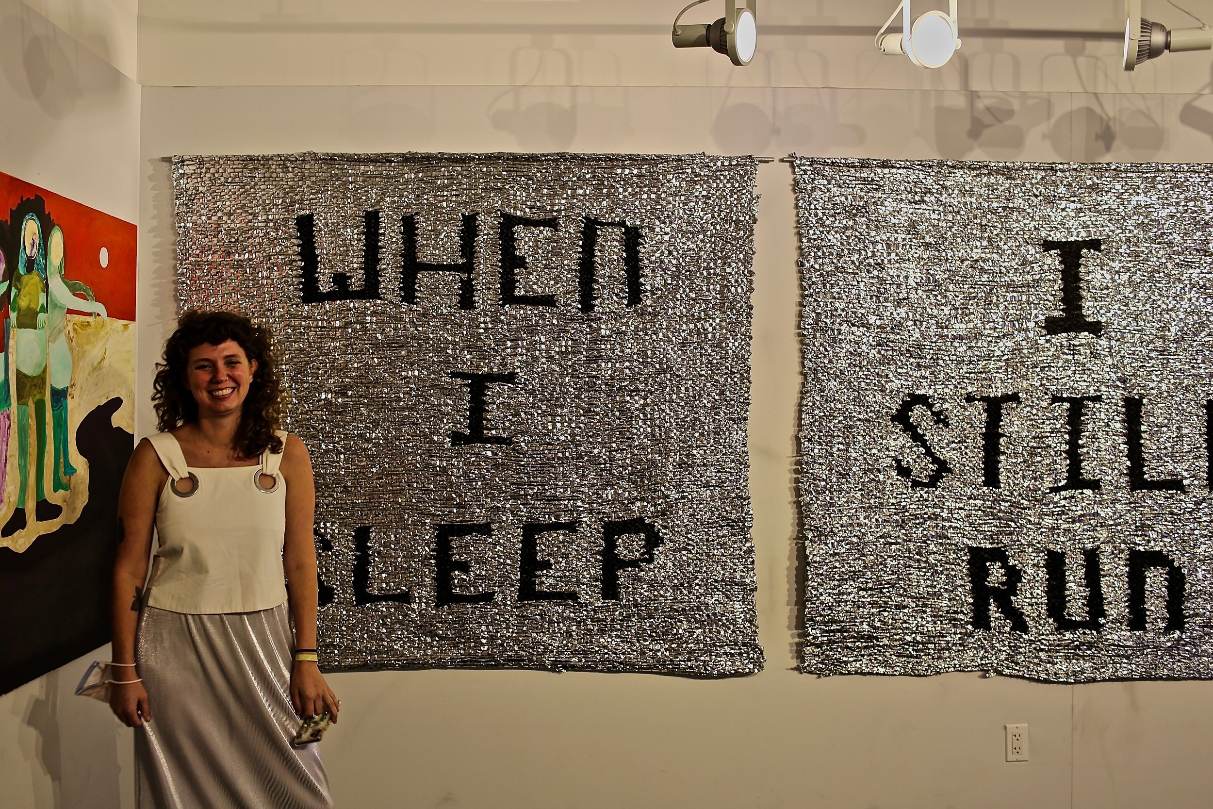 Skyler McLean in front of Untitled (Red & Blue), 2022, mixed media inkjet print on Pictorico, Kozo paper, and plaster, 40 x 60 in, curated by Noah Hornik.
