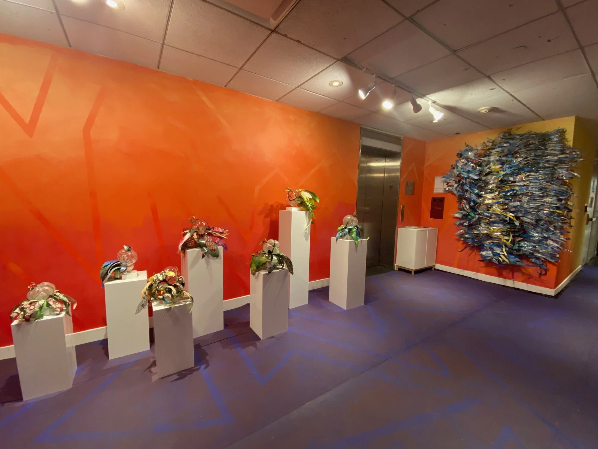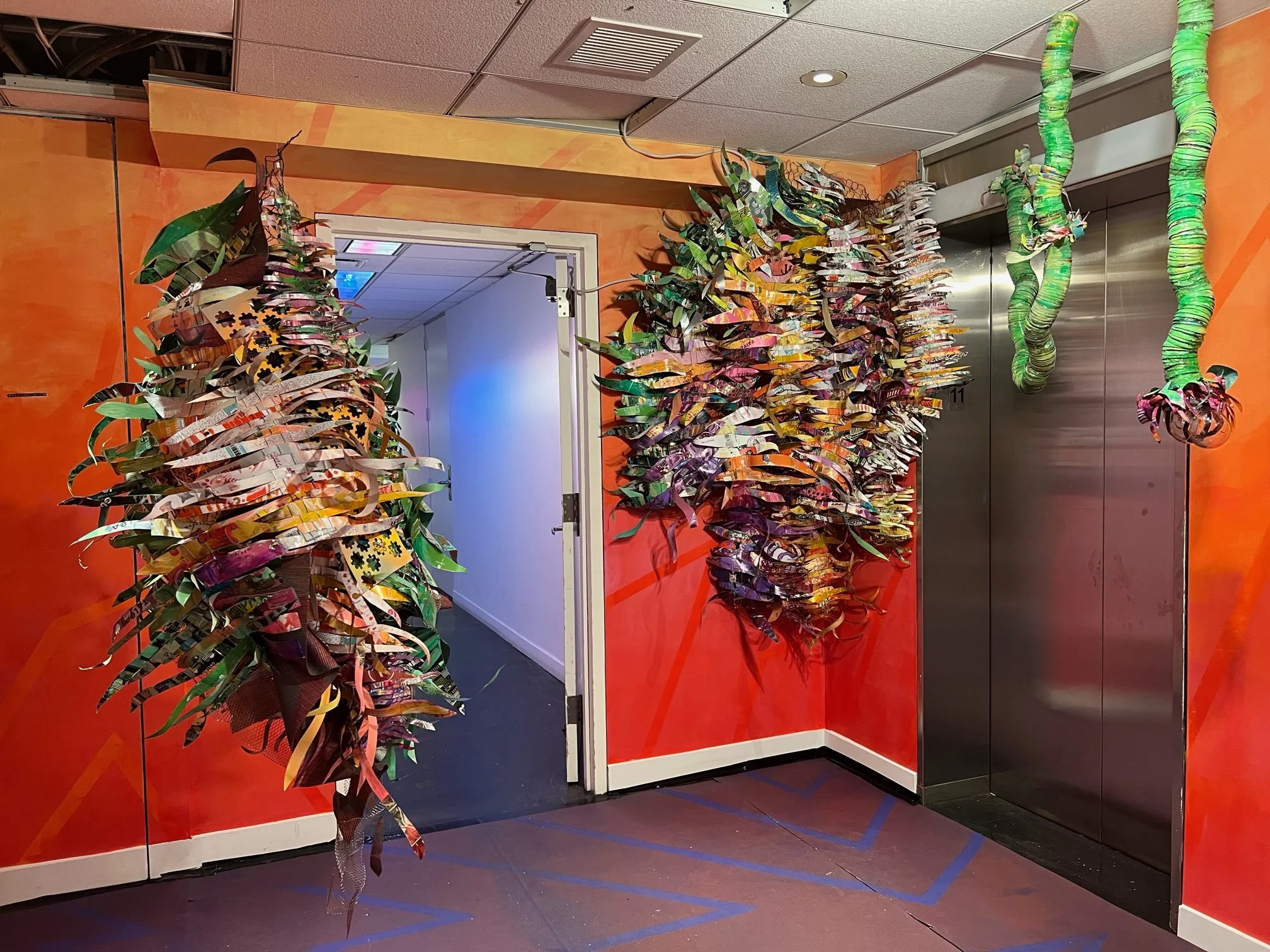 Situated near the elevators, Christina Massey’s sculptures are the first thing many see when arriving on the eleventh floor. Cut-up repurposed aluminum cans form leaves and tendrils sprawling across the booth’s walls and overflowing from pedestals. Rendered in vibrant metal, Massey’s foliage is delicate and robust. Its material connection to garbage and refuse serves as a reminder of humanity’s impact on the natural world.