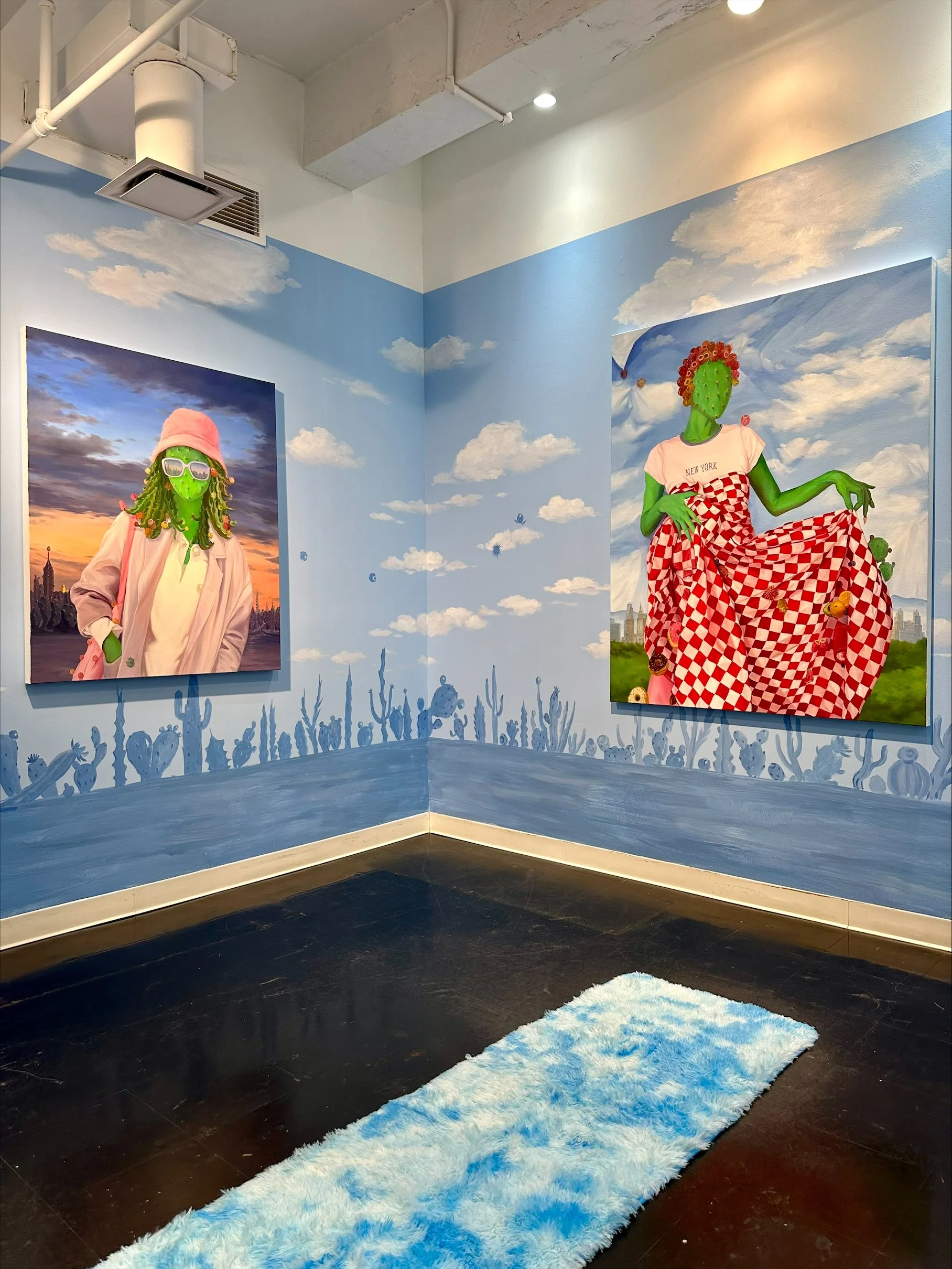 Alfred Steiner’s paintings oscillate between the physical and digital realms. Steiner employed the AI image generation engine Midjourney as a tool to reimagine two of his existing paintings. The artist then sent the output images to a painting studio in China where workers copied them onto canvases. The paintings are inextricably enmeshed in ethical issues around manual and digital labor. In an age when advancements in AI threaten jobs in creative fields, hand-painting an AI-generated image seems like an act of resistance. Still, the hands painting these images are those of workers caught up in the exploitative capitalist system.