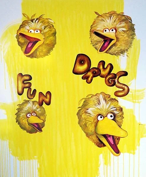 The painting Fun Drugs shows multiple images of Big Bird, invoking a humorous response in the viewer as long as one doesn’t think about what happens when the fun ends.