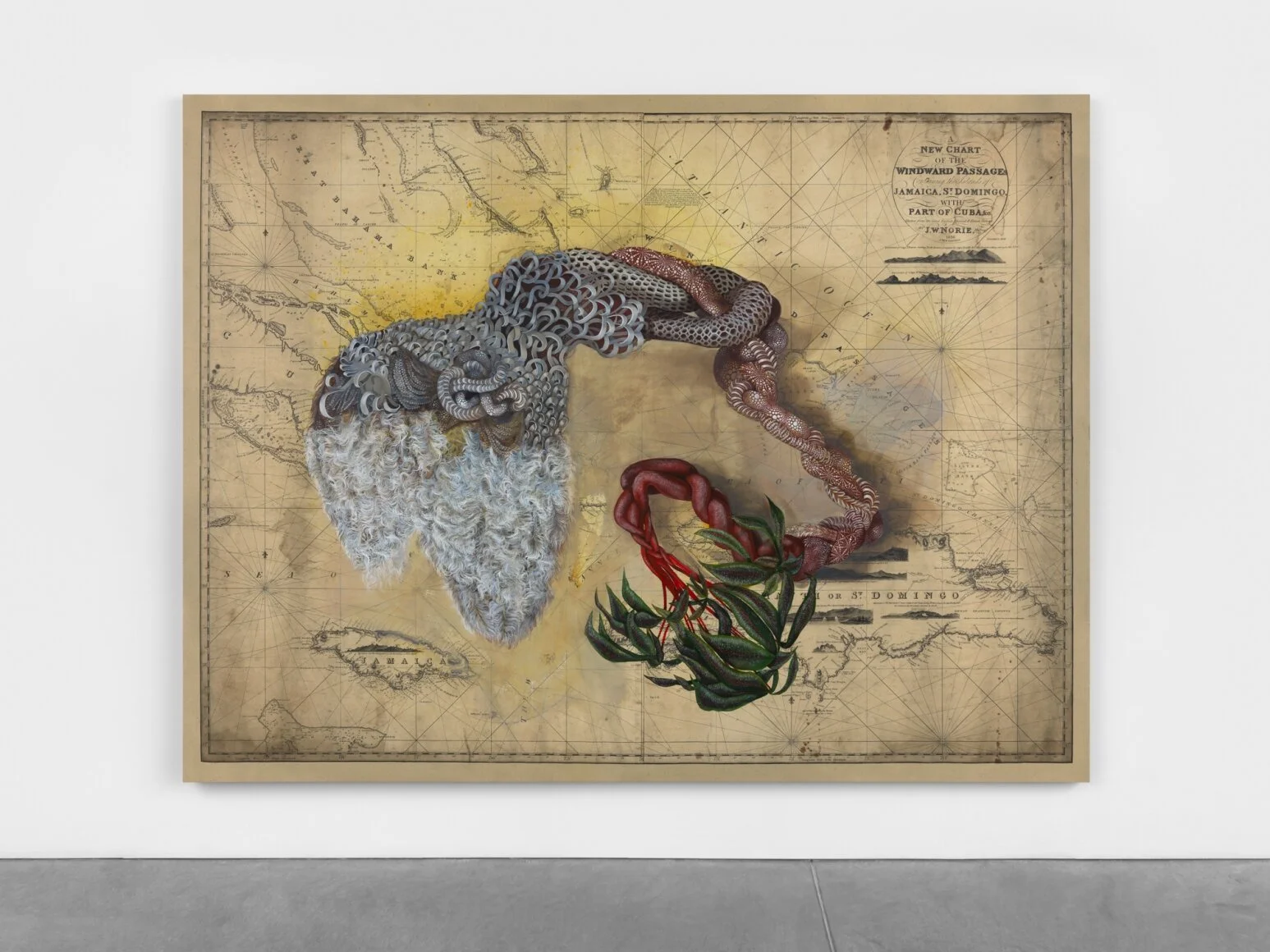 Báez is driven by her penchant for the mythological. She resists the vulnerable characterization of Black and Latin histories by consistently distorting colonially instilled hierarchies with folkloric references and cultural symbols. With her famous ciguapas, she continues to disrupt the notion of colonial assertions that European lands were of greater worth and stature than the rest of the world. With her painting, Untitled (Le Jeu du Monde), the florally embellished ciguapa offsets the center of the world as she stands powerfully over a canvas print of a French board game from the mid-1600’s. The game, Le Jeu du Monde, involved players rolling dice to move from the outer edges, which served as marked “corners” of the world, back to the center of the board: France. The ciguapa, typically referred to as a trickster, not only defies this unjust colonialist/capitalist “order”, but also indicates the abundant natural resources of the environment she resides in with her organic appendages.