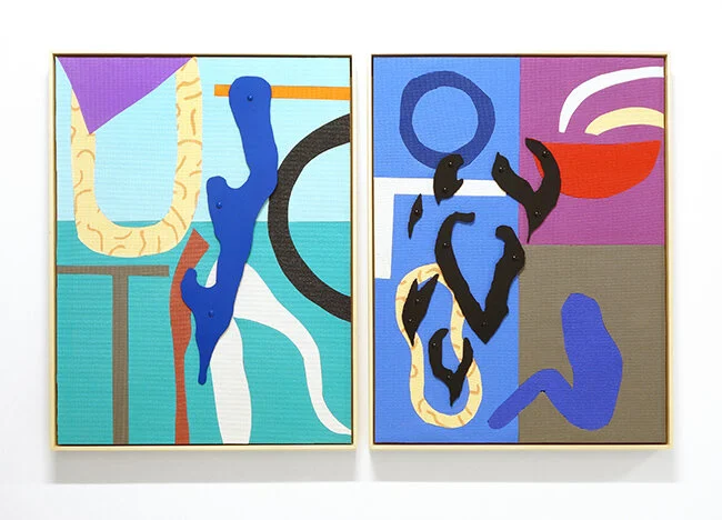 Alex Ebstein, Rebuilders 1 & 2, 2017, PVC yoga mats, acrylic, and powder coated aluminum on panel, 40hx 30 in each. Image courtesy of VICTORI + MO.