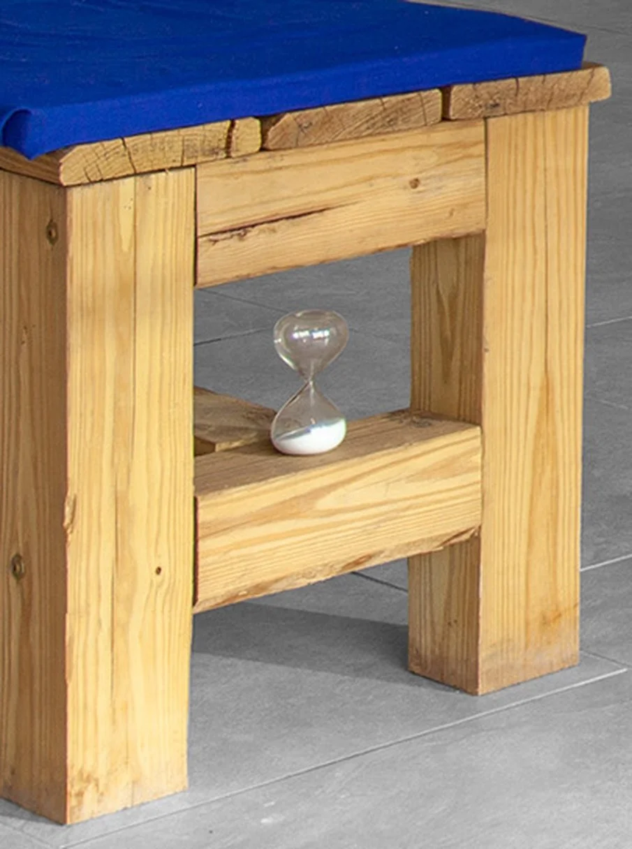 The first thing seen upon entering Rosemary Warren’s exhibition, Hope’s Horizon: three television screens mounted on the wall. A long bench sits in the middle of the space about nine feet away from the screens. An interesting feature of this bench: on its side brace sits a small hourglass, its presence immediately recalling the hourglass from the iconic soap opera Days of Our Lives, a hallmark of the genre. The hourglass is also a timeless symbol of containing and observing time within an enclosed vessel. For us, starting in the mid-20th century, that enclosed vessel is the hourglass of the TV screen.