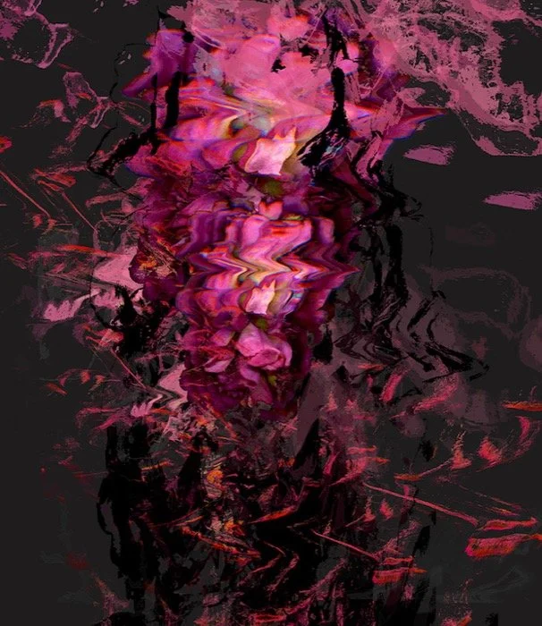 Willhide’s images have a more profound significance beyond the novelty of the glitch aesthetic, commenting on the ongoing climate crisis by incorporating natural and artificial flowers in her compositions — the swirling glitches preventing the viewer from differentiating between them. The line between nature and the fake becomes blurred and distorted. The category of the natural has lost its significance as unnatural substances such as microplastics and “forever chemicals” have tainted even the most remote regions of Earth. To quote Don Quixote, “Everything is artifice or illusion.”