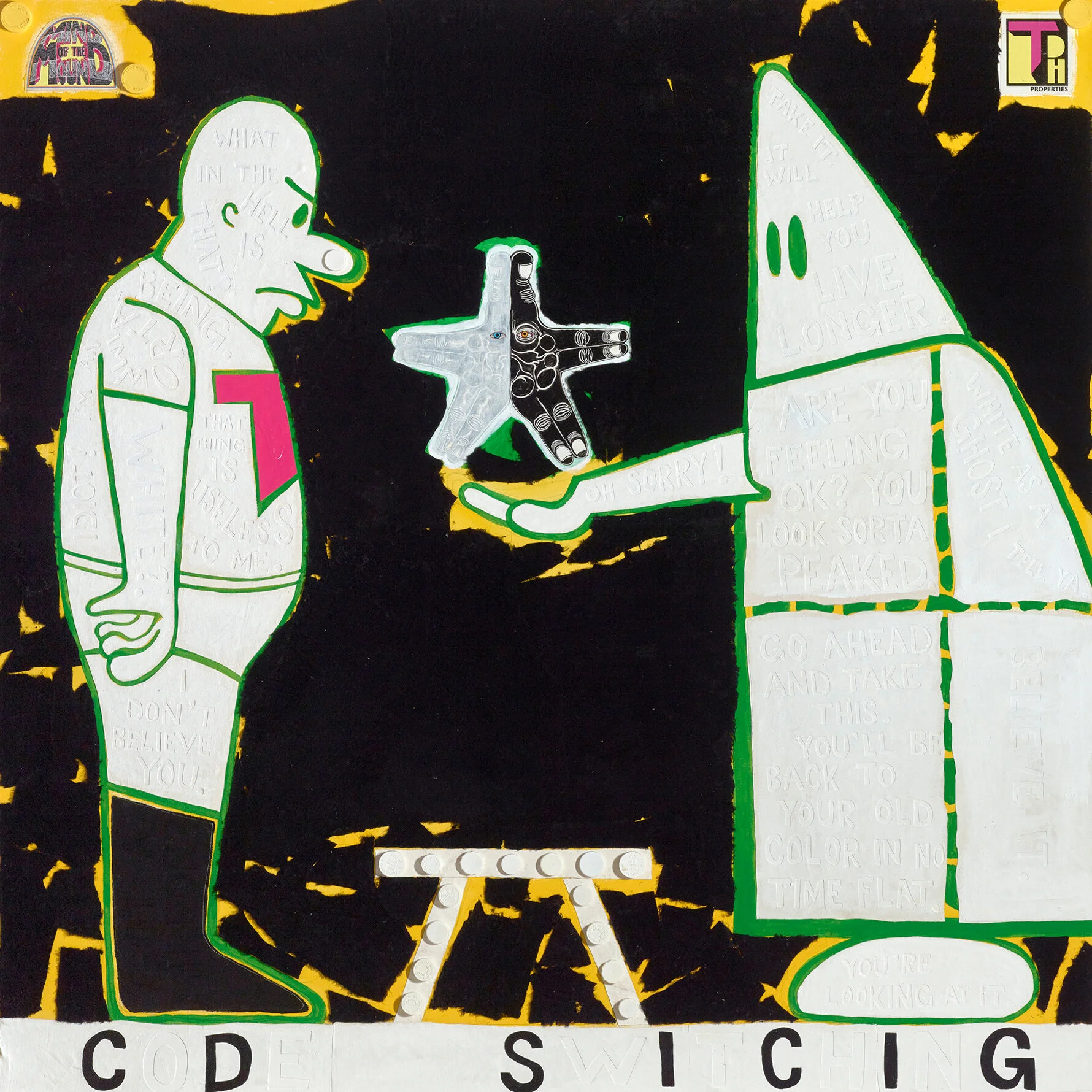Trenton Doyle Hancock, Step and Screw: The Star of Code Switching, 2020, acrylic, graphite, plastic tops, and paper collage on canvas, 84 x 84 in. © Trenton Doyle Hancock 2020. Image courtesy the artist and James Cohan, New York. Photo by Phoebe d'Heurle.