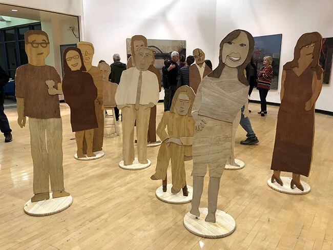 Years ago, I traveled to Toronto from my hometown near Detroit to see the Ontario Museum’s exhibit of Chinese paper making and terracotta sculptures of Chinese soldiers. The stunning installation of about 200 full sized figures floored me. I had a distinct feeling of déjà vu upon entering the West Los Angeles College Gallery to view Los Angeles artist Stuart Rapeport’s wooden sculptures of the L.A. art world’s seasoned veterans and art world aspirants.