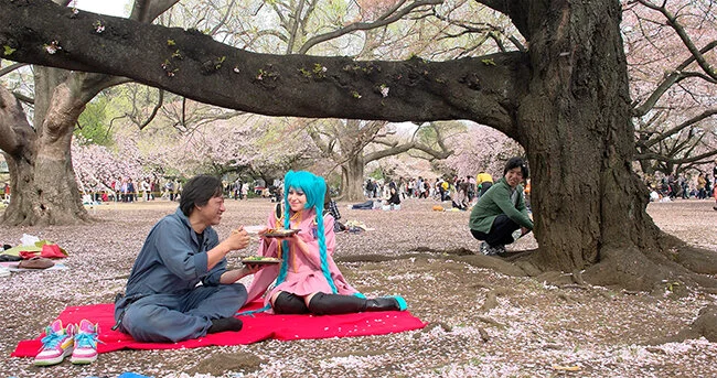 One fan who accompanies M on and off throughout the film is @umekiti3396, a middle-aged man who, like yukky, preferred to be credited as his Twitter handle. Umekiti is known within Japan’s Miku fandom for his van that he has plastered, inside and out, with images of Miku. Like M, little is revealed about his background except that he subsidizes these expensive customizations by working as a security guard in a department store. He and M eat bento lunches in the park: “Dining with a Miku under a cherry blossom tree is a dream come true for me.” Later, M alludes to this moment in a conversation with a therapist, concerned that he is attracted to her incarnation of Miku rather than to her as a person. The therapist, more interested in M’s cosplay than anything else, asks her patient for an impromptu Miku makeover. M puts her spare aqua-colored wig on the therapist’s head and helps her apply makeup and fake eyelashes, much to the woman’s delight.